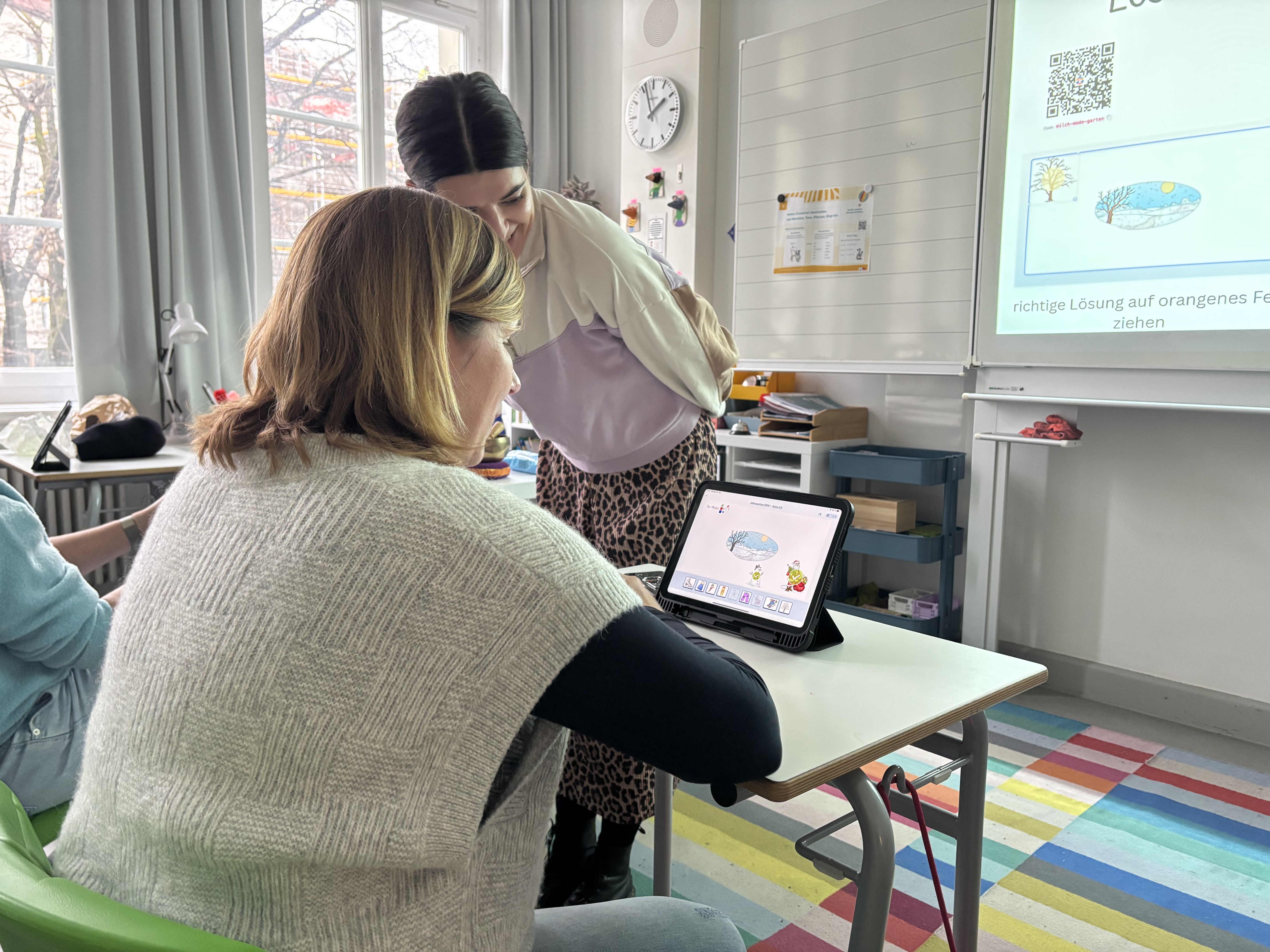 Die Lehrkräfte zeigen sich gegenseitig, wie sie mit dem Tablet unterrichten.